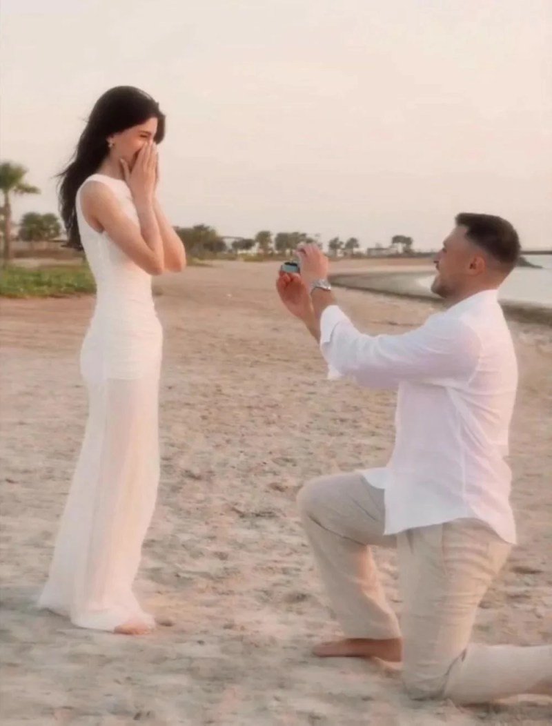 حيث ظهر رامي حمدان وهو يتقدم لطلب يدها لحظة غروب الشمس على شاطئ البحر في دبي. المشهد الذي وصفه المتابعون بـ«السينمائي» أظهر أجواءً مليئة بالرومانسية والرقي، وسط تنسيق لافت وديكور بسيط يعكس أجواء خاصة ومميزة.
